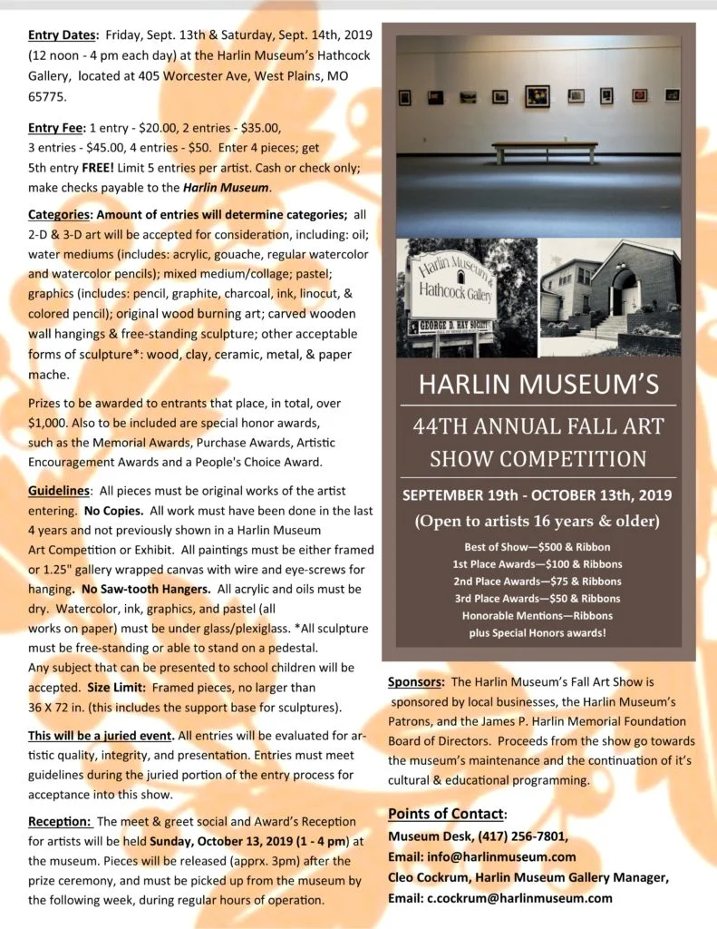 Entry Dates: Friday and Saturday, January 4 & 5, 2019, 12 noon to 4 pm at the Harlin Museum in the Hathcock Gallery, 405 Worcester Ave, West Plains, MO 65775, (417) 256-7801.