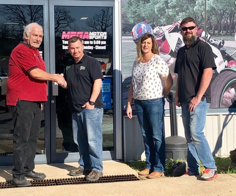 Larry Lindeman, Harlin Museum Board Member, accepting a $550 donation for the Harlin Museum’s High School Art Show from Mega Motorsports General Manager, Luke Stokes, and other members of the Mega Motorsports team